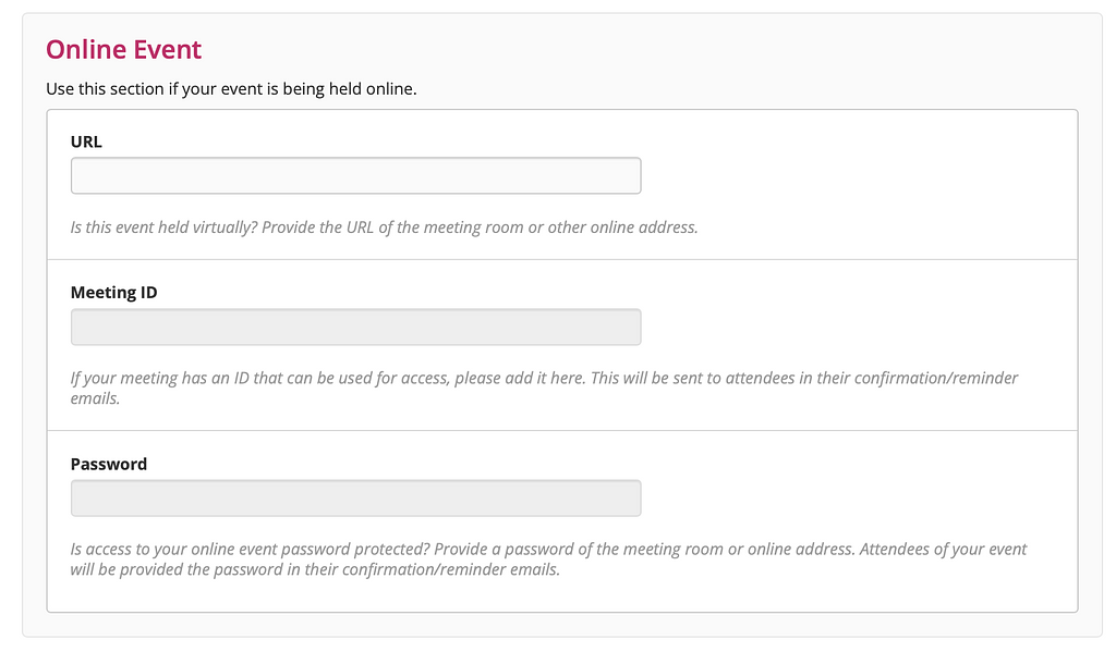 If you're running an online or streaming event, here's where you can fill in details specifically for those type of events.