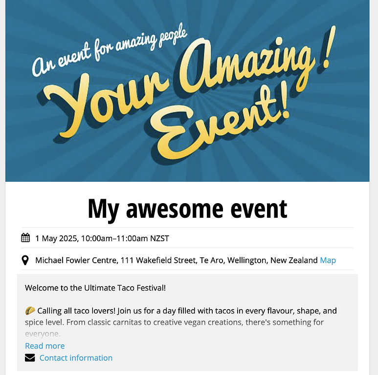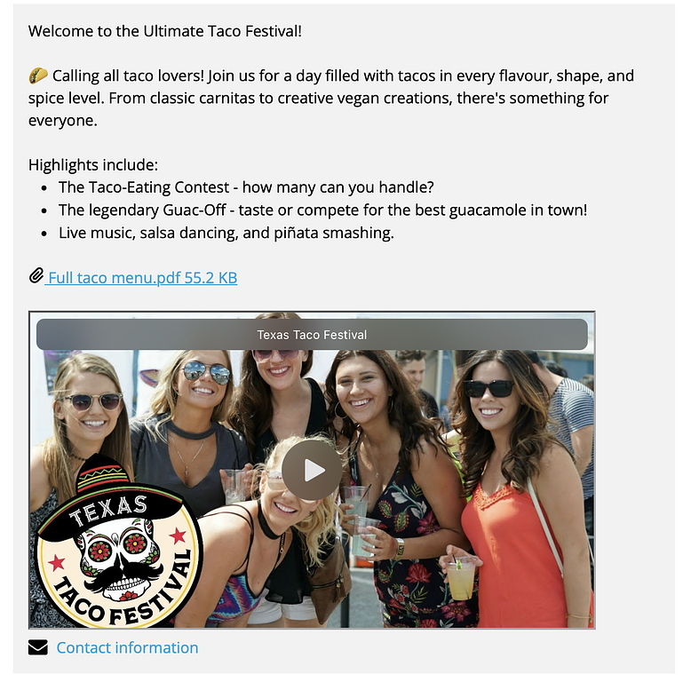 You can format event descriptions using our rich text editor. Format your copy, set headers, add attachments, links and images, and even embed YouTube videos.