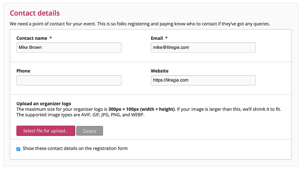 Next, add contact name and email, and optionally, phone, website address, and your logo.