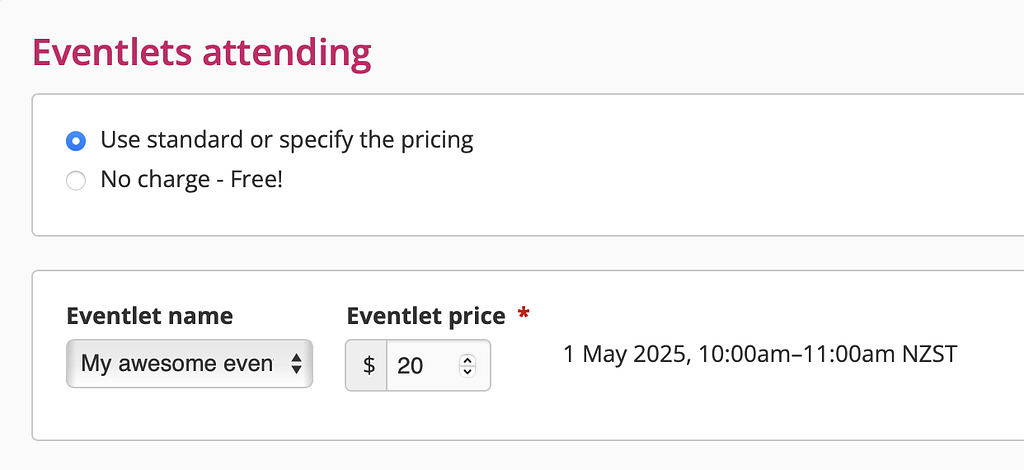Then you can choose whether to charge them standard pricing for your event, another price of your choosing, or not to charge them at all (i.e. free!). To add in your own price, just replace the default amount with that new price.
