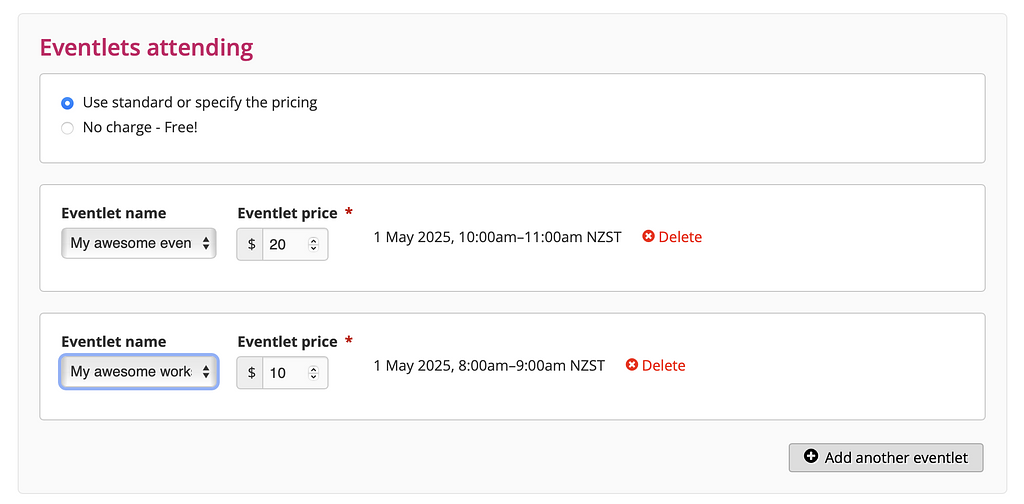 If you have more than one eventlet, then you can register them for more eventlets via the “Add another eventlet” button.
