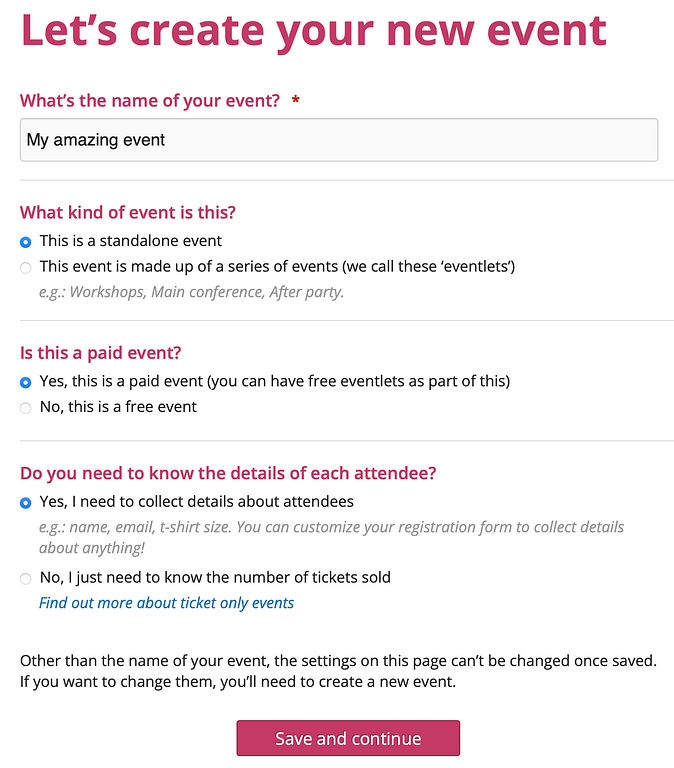 The first thing you need to do when creating your event is to build a registration form so that people can register. To start, click on the “Create an event” button. The next steps are choosing whether it’s a standalone event or whether it’s made up of what we call ‘eventlets’; whether it’s a paid or a free event; and whether you're collecting details about attendees or not.