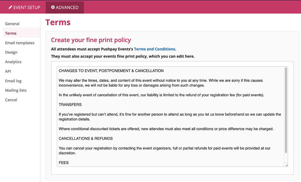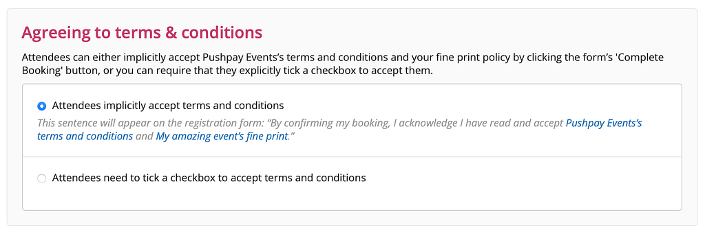 In terms of the fine print, Pushpay events has its own set of terms and conditions, which all attendees must accept as part of the booking process. But we've got a fine print section too where you can create your own page with the terms and conditions specific to your event. There’ll be a link to these from the registration form and you’ll also be able to send people directly to the page if they inquire.