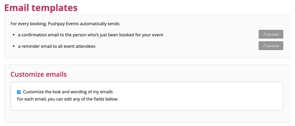 In the Advanced section you can preview the emails that get sent, as well as customise the wording of individual emails.