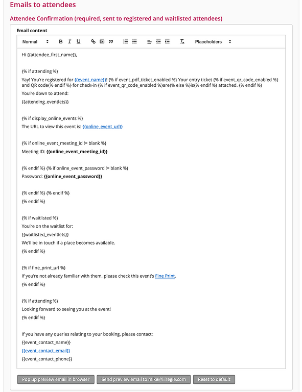 (Note the above screenshot shows the use of conditional text- the display of text based on certain conditions. For example, if the recipient of the email is an attendee, then that associated text will display. But if they are waitlisted, different text will display in the email they receive. It's important to note that the preview emails will include both of these, so don't be alarmed if you see them together at this stage!)