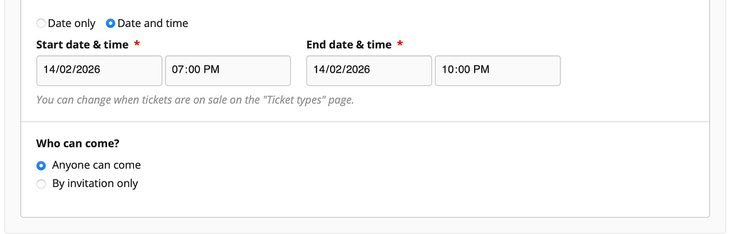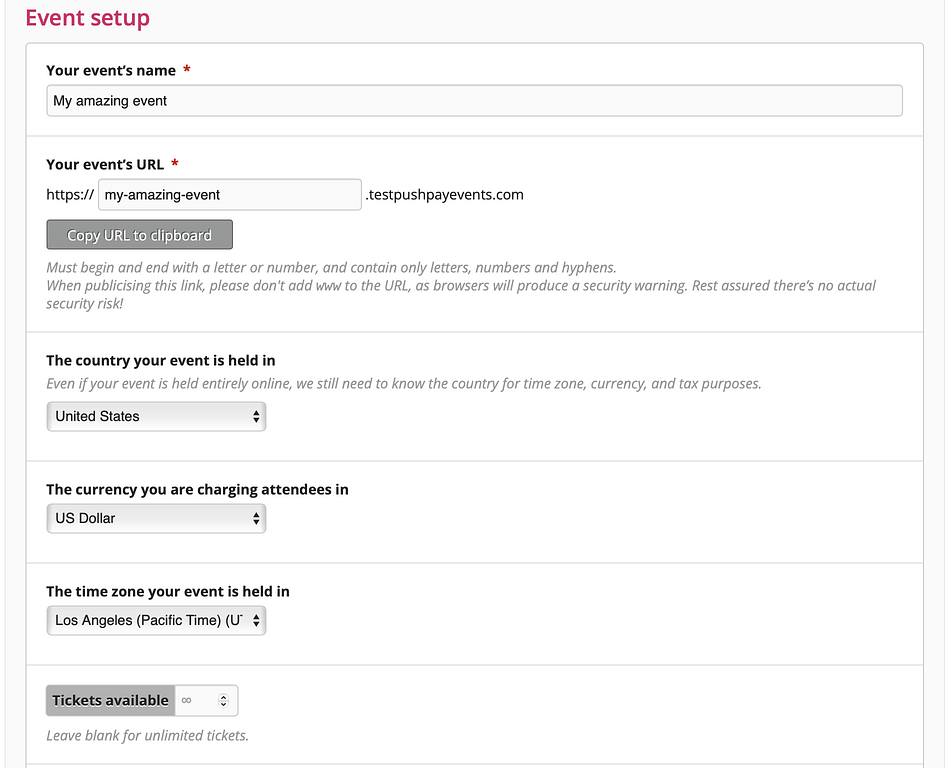 Once you’ve finished this screen, click the "Save and continue" button and you’re ready to choose what sort of tickets you want to sell and their prices!