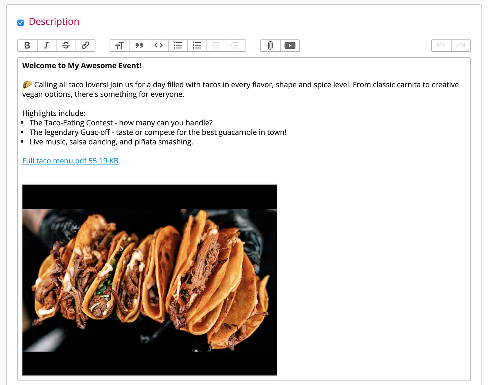 You can format event descriptions using our rich text editor. Format your copy, set headers, add attachments, links and images, and even embed YouTube videos.