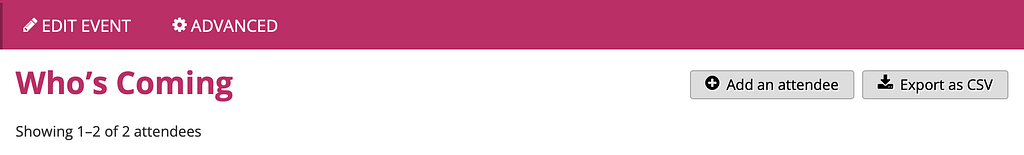 Go to your event and then to the “Who’s coming” section. You’ll notice an “Add an attendee” button up in the right hand corner.