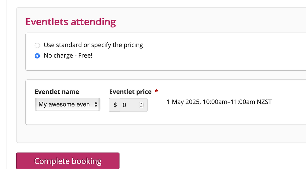 Then you can choose whether to charge them standard pricing for your event, another price of your choosing, or not to charge them at all (i.e. free!). To add in your own price, just replace the default amount with that new price.