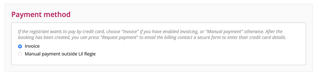 When choosing a payment method, you are generally going to choose "Invoice". Lil Regie will then create an invoice for you and send it out to the billing contact.